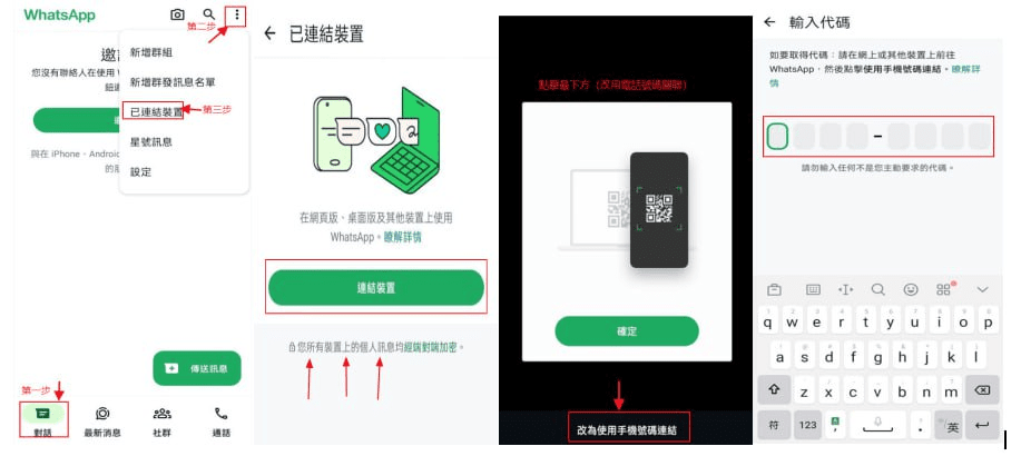 🟢iPhone【操作提示】:開啟WhatsApp--點選【設定】--【已關聯的裝置】--【連結新裝置】--【改用電話號碼關聯】--輸入【安全碼】 🟢Android【操作提示】:開啟WhatsApp--點選右上角【⋮】--選擇【已關聯裝置】--點選【關聯新裝置】--【改用電話號碼關聯】--輸入【安全碼】